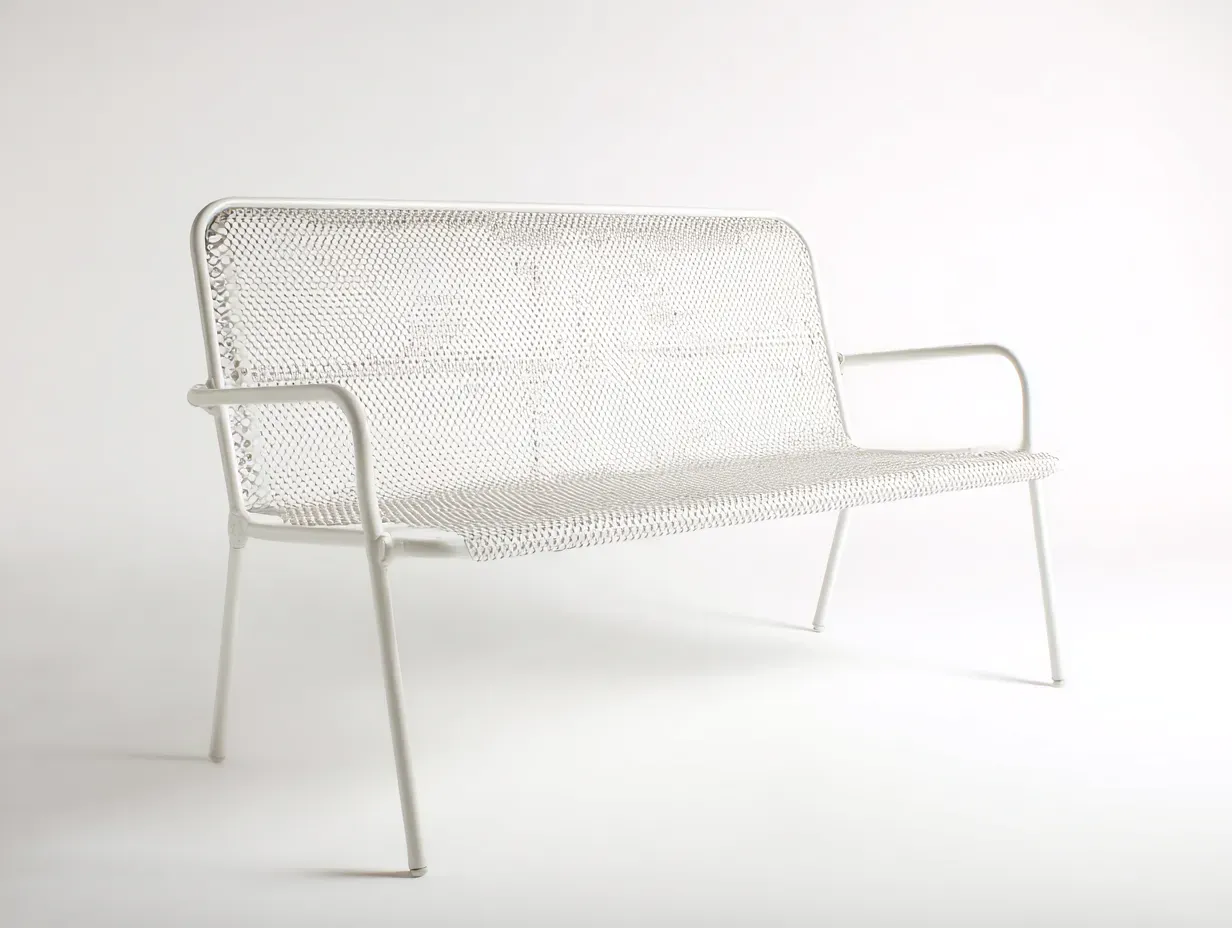 Banco de exterior diseñado para crear una zona de descanso cómoda y visualmente ligera en terrazas, jardines, balcones amplios o espacios de reunión al aire libre. Su silueta abierta y el uso de superficies perforadas aportan una presencia más liviana dentro del entorno, ayudando a que el espacio mantenga una lectura limpia y despejada. El acabado en blanco marfil refuerza la luminosidad del conjunto y permite integrarlo con facilidad en ambientes residenciales, patios modernos o composiciones exteriores de estética serena.
