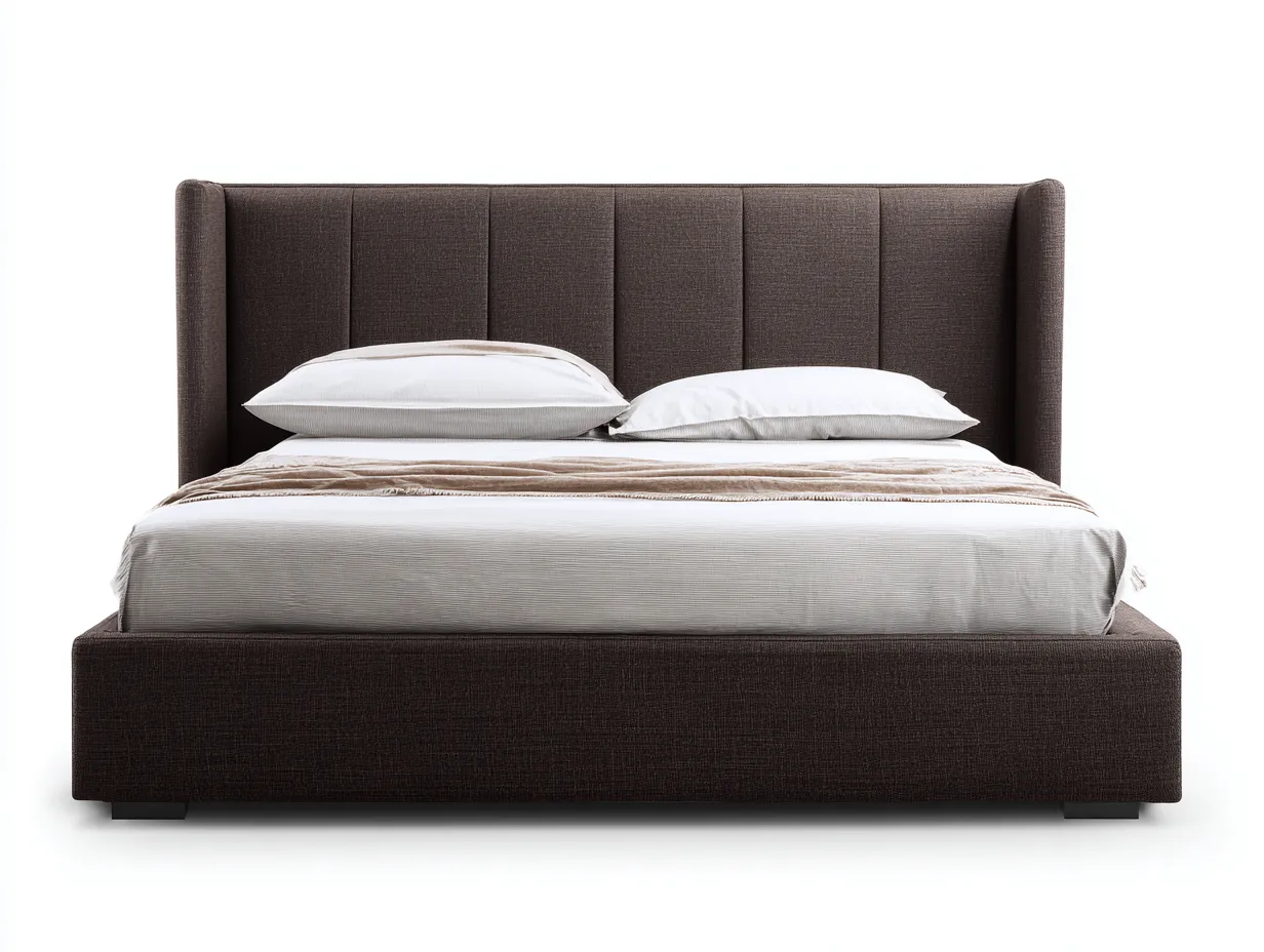La base está fabricada en madera con acabado marrón de tono medio, adecuada para aportar sensación de calidez visual y buena combinación con mesillas, cómodas o armarios en materiales similares. El cabecero incorpora una superficie acolchada revestida en tejido gris, agradable a la vista y apropiada para suavizar el conjunto. La unión entre madera y textil crea un contraste equilibrado que favorece una decoración más acogedora sin recurrir a elementos excesivos.