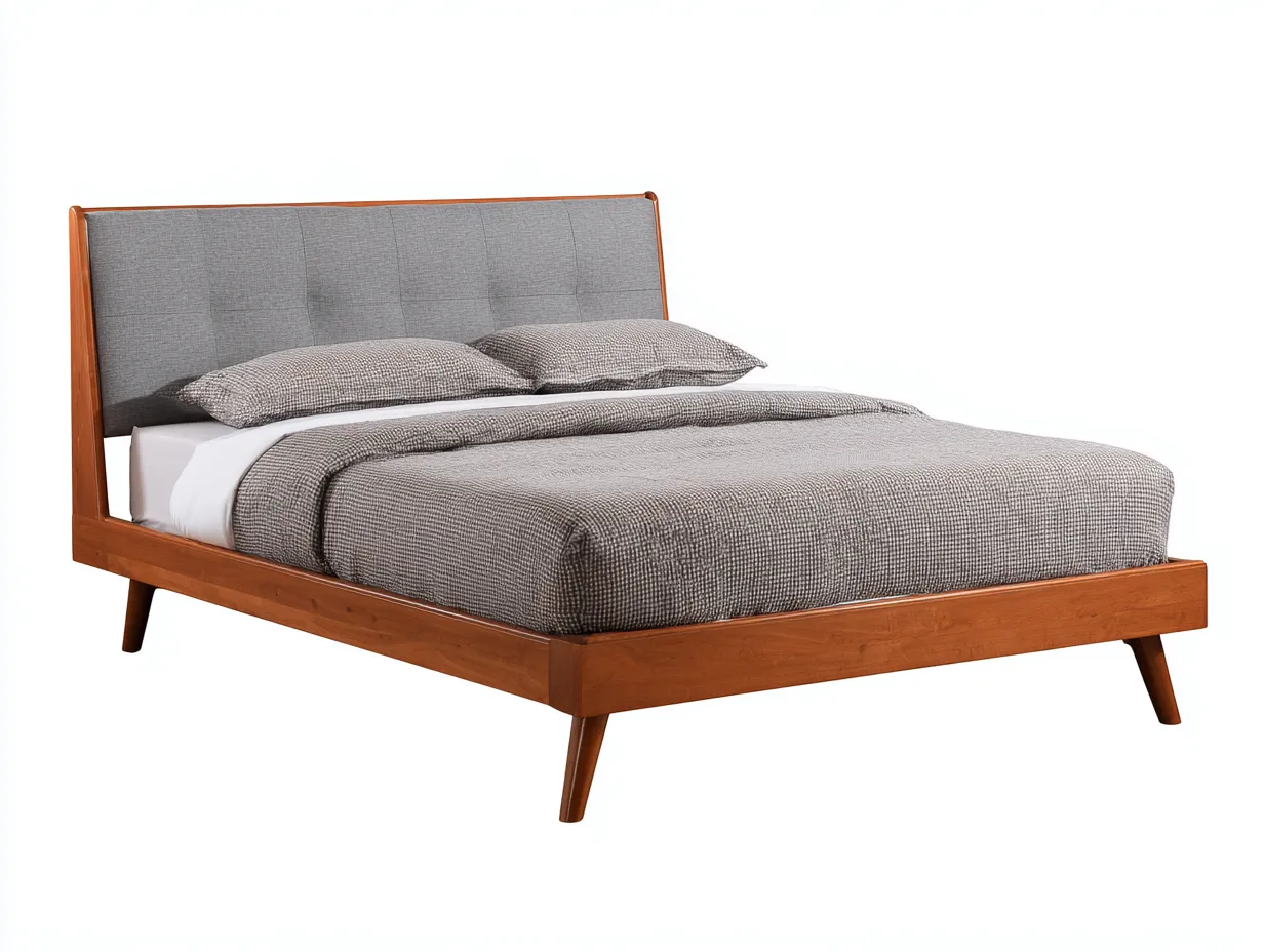 La estructura exterior está fabricada en madera con acabado marrón nogal, una tonalidad que aporta sensación acogedora y combina con facilidad con textiles neutros o mobiliario de tonos tierra. El cabecero incorpora un panel tapizado en color gris, pensado para suavizar el contacto y añadir contraste visual al conjunto. La base y las patas elevadas refuerzan la estabilidad del mueble y contribuyen a una imagen ligera dentro del espacio.