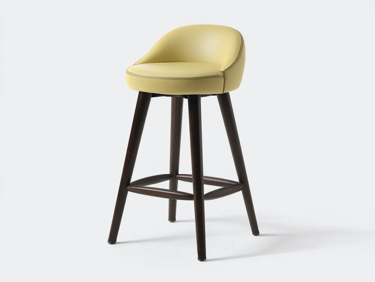 Taburete alto diseñado para completar barras de cocina, islas centrales o zonas de comedor informal con una presencia elegante y bien proporcionada. Su asiento con respaldo curvado genera una silueta envolvente que suaviza el conjunto y aporta una imagen más cuidada dentro del espacio. La combinación de tapizado en amarillo claro y base en marrón oscuro introduce contraste visual sin resultar excesiva, por lo que encaja con interiores contemporáneos, residenciales y ambientes de inspiración cálida.