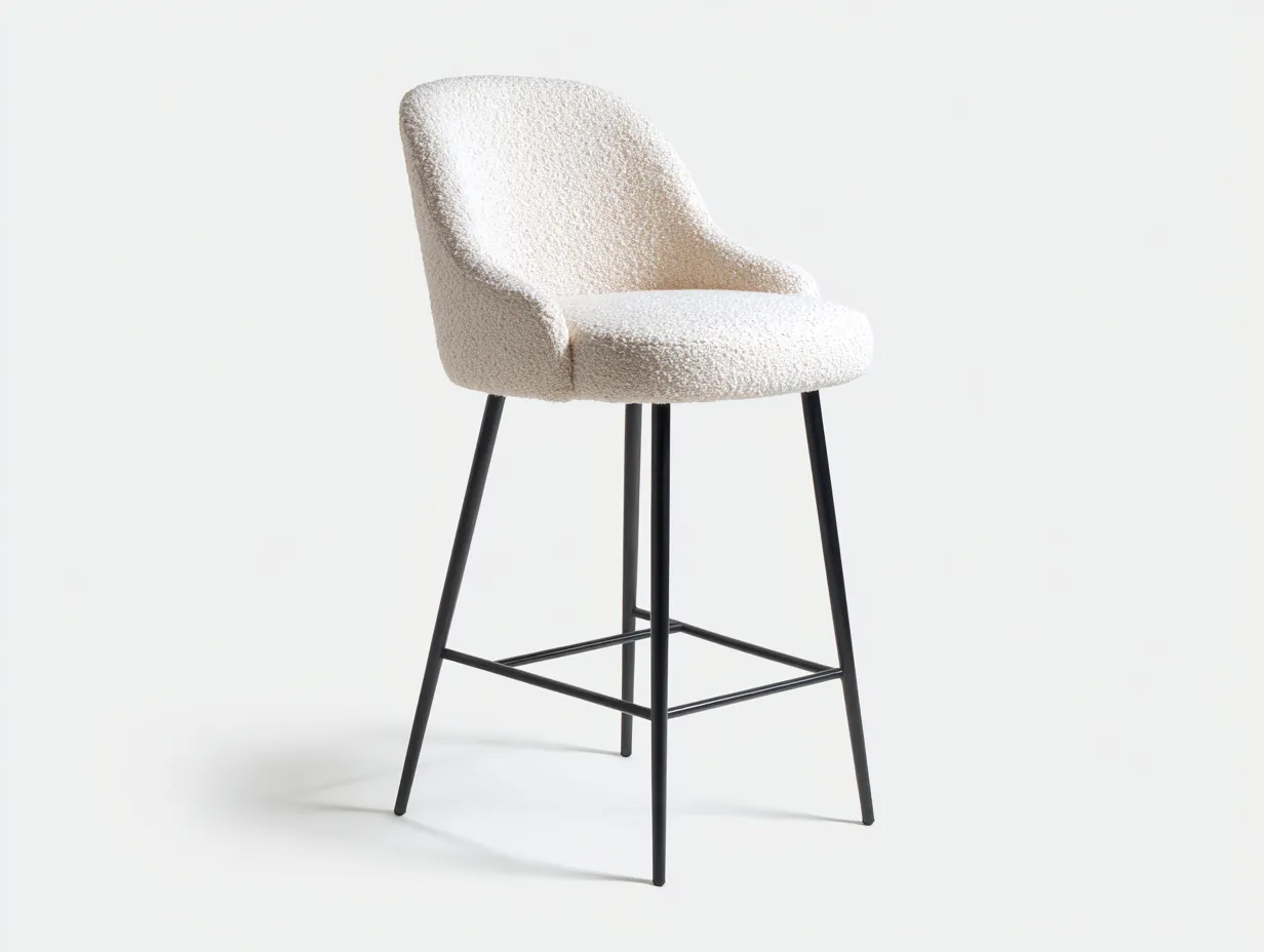 Este taburete de barra bouclé está pensado para aportar una imagen más cálida y sofisticada en cocinas abiertas, barras domésticas, comedores contemporáneos o espacios de reunión informal. La combinación entre asiento envolvente tapizado y estructura metálica fina crea un equilibrio atractivo entre confort visual y ligereza. Su presencia resulta adecuada para interiores donde se busca suavizar el ambiente con texturas agradables, manteniendo al mismo tiempo una estética actual y fácil de combinar con encimeras de piedra, madera o acabados lacados.